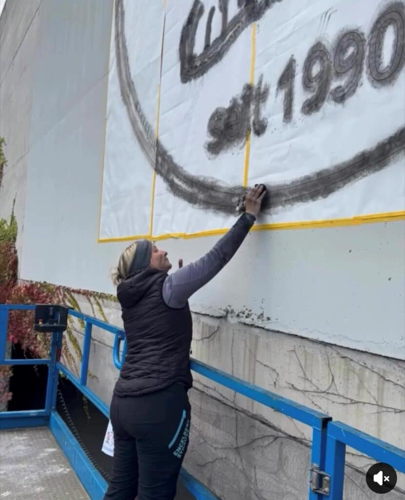 Auf dem schrägen Gelände wurde die Scherenbühne exakt in die Waage gebracht – dann begann der kreative Teil. Unsere schwindelfreien Spezialisten Martina Auernig und Robert Glanzer arbeiteten in bis zu 15 Metern Höhe, um Logos und Schriften präzise auf die Betonflächen zu übertragen. Anschließend wurden die Farbtöne individuell gemischt und die Flächen detailgetreu nach Entwurf gestaltet.