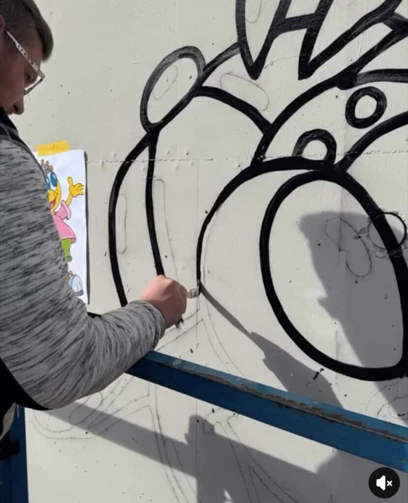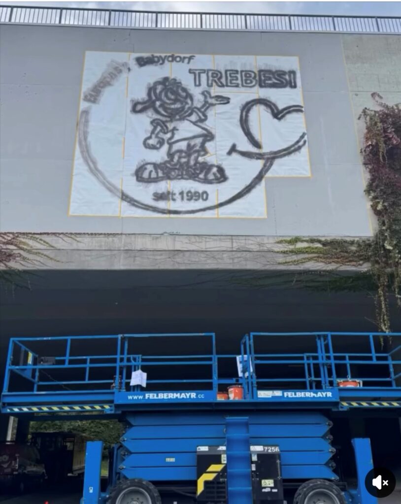 Unsere Grafikspezialistinnen und -spezialisten Johanna Hohenberger und Charly Oberlerchner bereiteten hochwertige Pausen vor, die später auf die Wandflächen übertragen wurden. Bevor es losgehen konnte, mussten sämtliche verkehrstechnischen Auflagen erfüllt werden – darunter Straßenverengung, Geschwindigkeitsreduktion, Hinweisbeschilderungen sowie das Aufstellen der vorgeschriebenen Warnkegel.