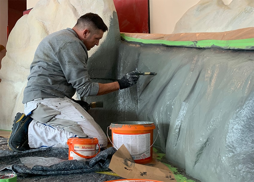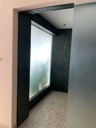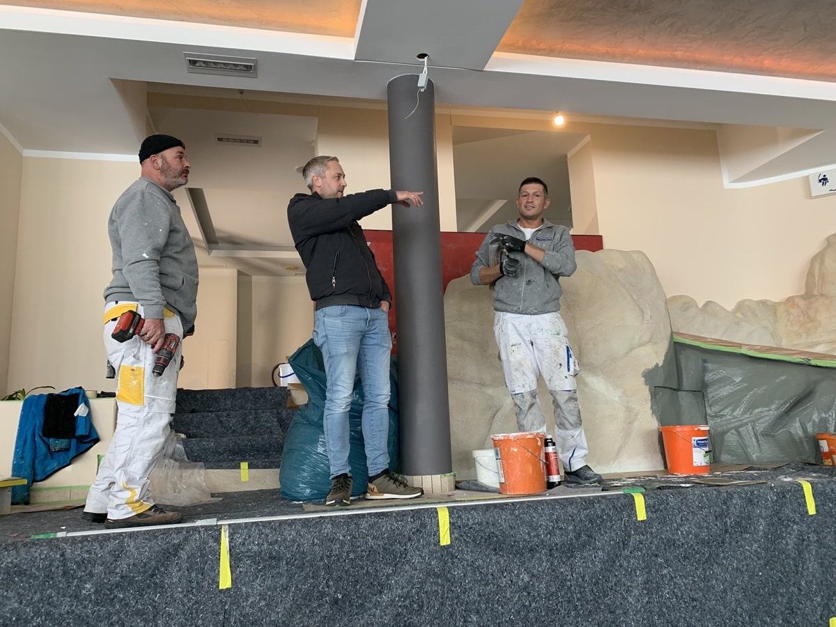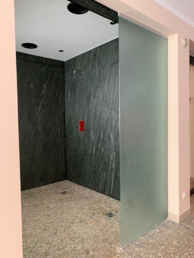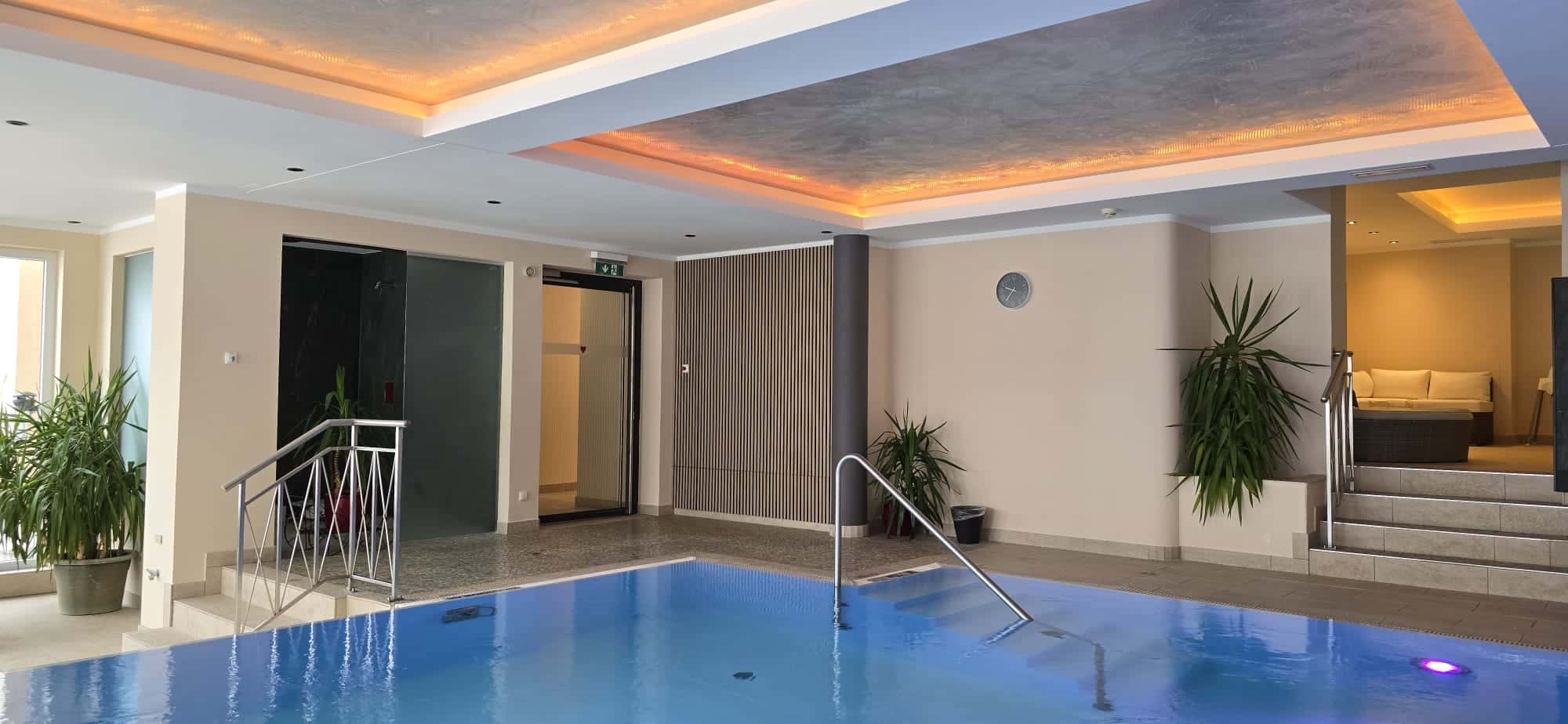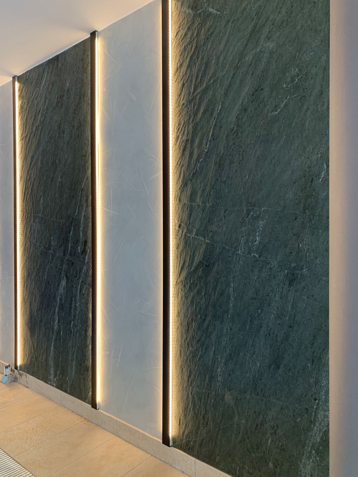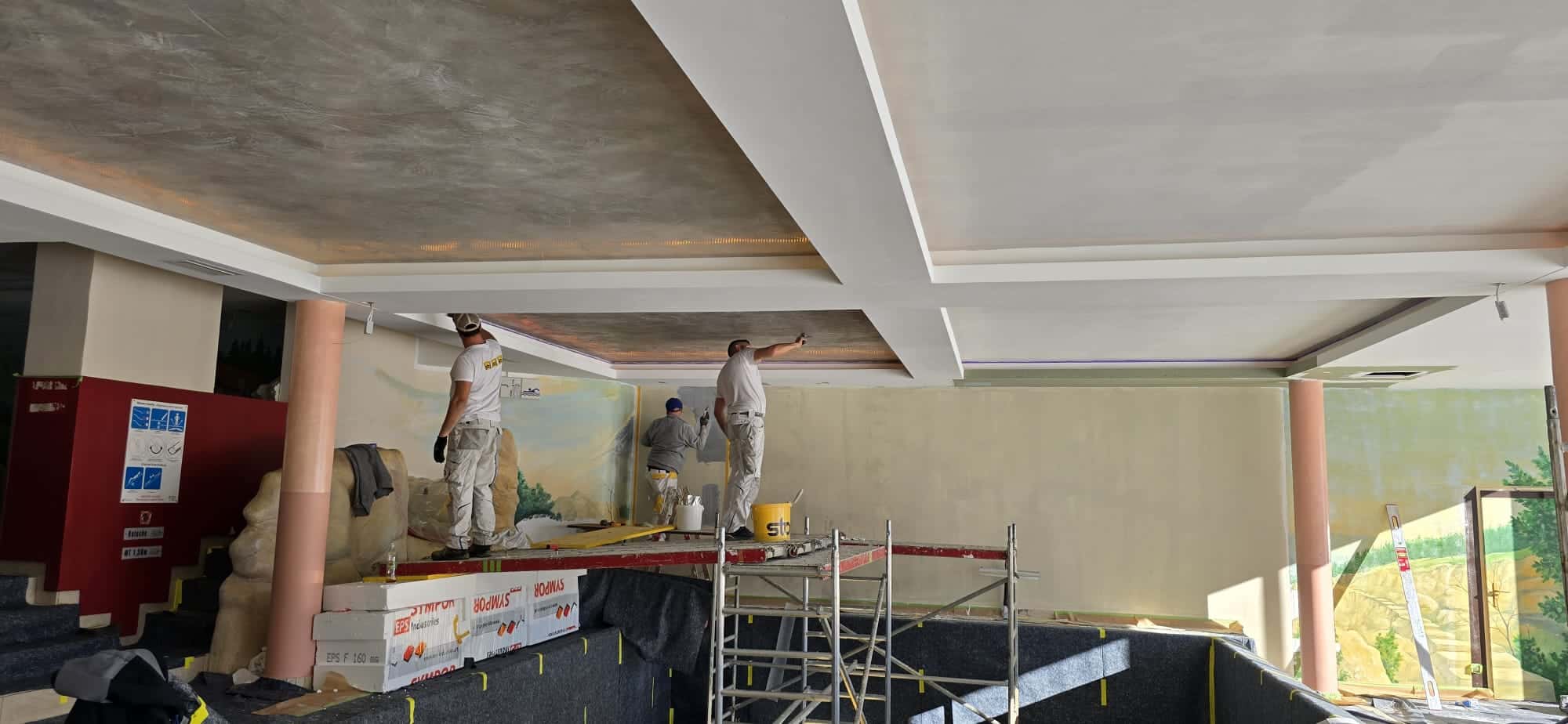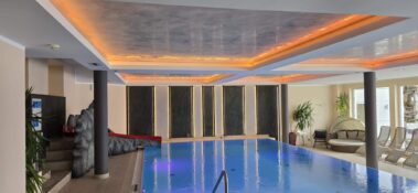 Die bestehende, nicht mehr zeitgemäße Malerei erhielt durch eine moderne, mit innovativen Materialien und interessanten Lichteffekten erreichte Gestaltung ein neues Erscheinungsbild. Hochwertige, 2 mm starke Echtsteinfurniere in der Dusche und an verschiedenen Wänden im Bad zeugen vom alpinen Charakter der Region, sowie Schallschutzelemente und mehrlagig ausgeführte Volimea-Spachteltechnik an der Decke bringen zusätzlich Eleganz in das Bad. LED-Lichteffekte vervollständigen den tollen Gesamteindruck bei Tag und am Abend.